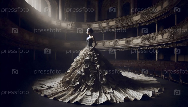 Невеста в платье из тканей черного музыкального манускрипта, стоящая в заброшенном оперном театре Ai generated image