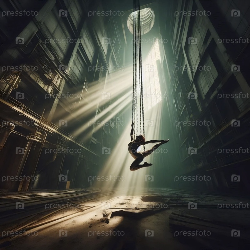 Современный танцор висит на цепях в заброшенной электростанции, один луч света, Ai generated image