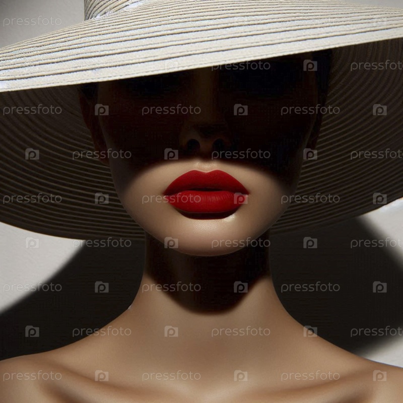 Широкошерстная шляпа, бросающая глубокую тень на лицо модели, видны только ее красные губы, Ai generated image