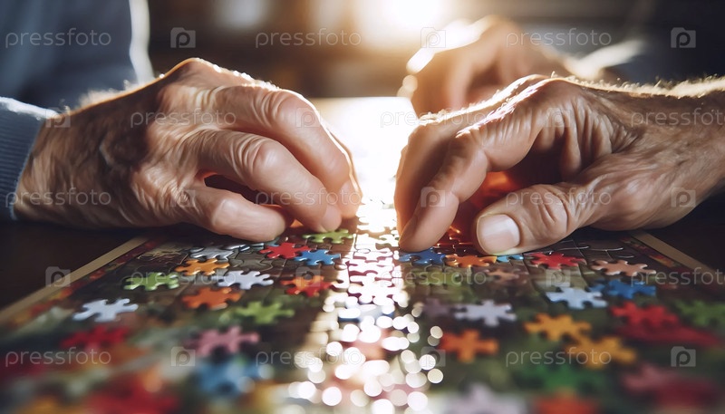 Клубовый снимок старых и молодых людей, работающих вместе над созданием головоломки на кухонном столе