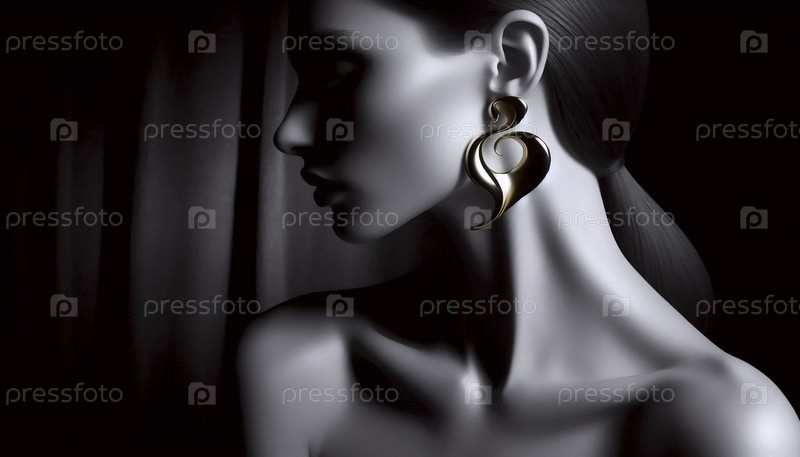 Профиль женского уха с большой, скульптурной золотой серёжкой на черном фоне Ai generated image