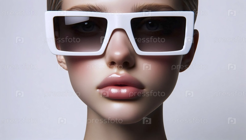 Лицо женщины, спрятанное за большими солнцезащитными очками с белой рамой, бледные губы разделились, Ai generated image