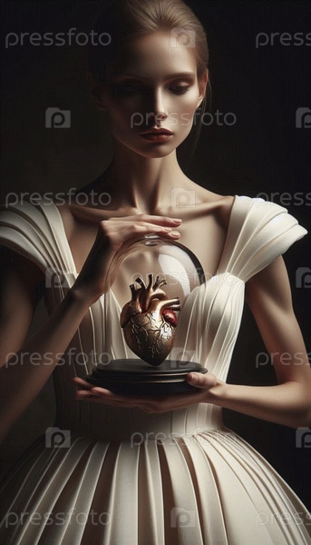 Невеста держит человеческое сердце в стеклянной колокольни как редкий образец, Ai generated image