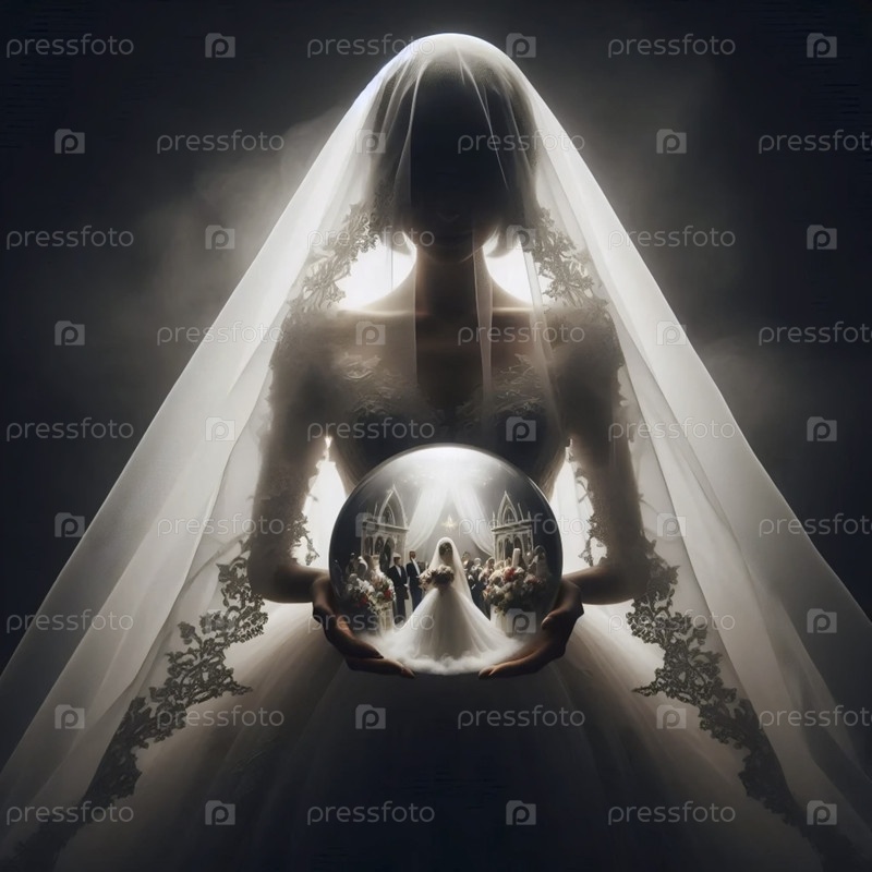 Невеста в виде замаскированного оракула, лицо скрытое, держащая туманный кристаллический шар с крошечной сценой внутри, Ай создала изображение