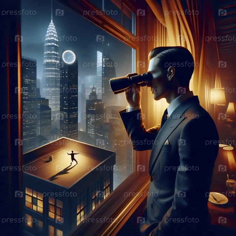 Генеральный директор в пентхаусе смотрит на уличную танцовщицу на крыше через бинокль, Ai generated image