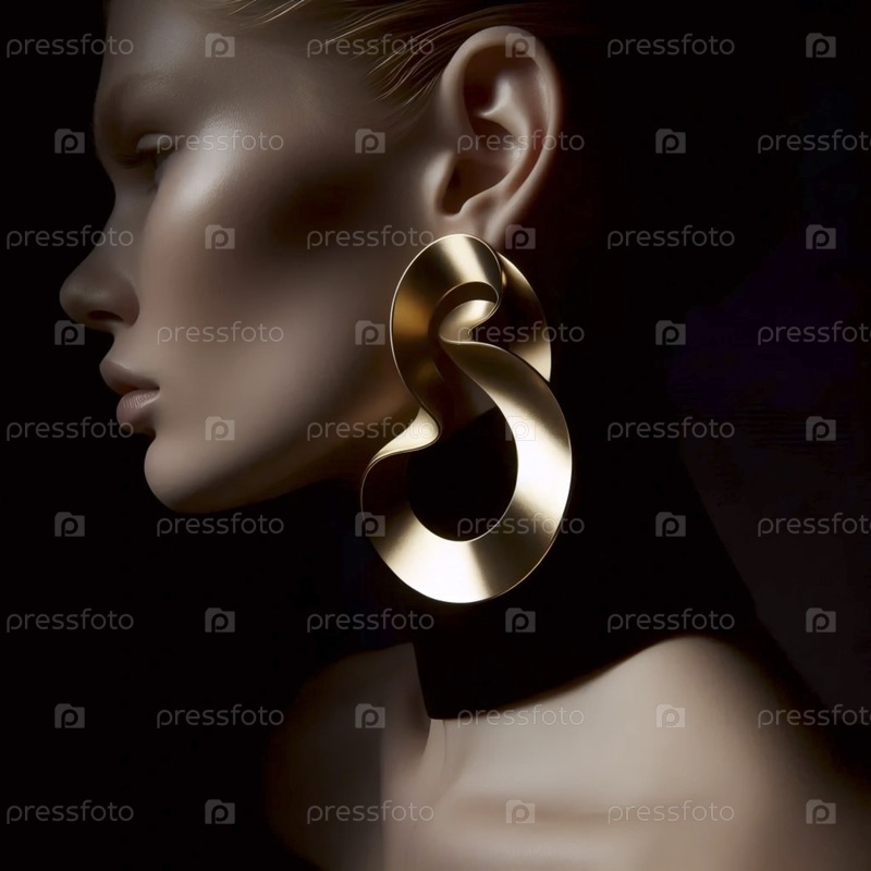 Профиль женского уха с большой, скульптурной золотой серёжкой на черном фоне Ai generated image