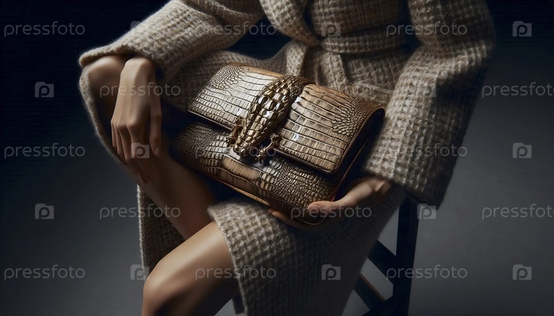 Сцепление крокодиловой кожи, опираясь на колено модели, покрытое твидовой юбкой, Ai generated image