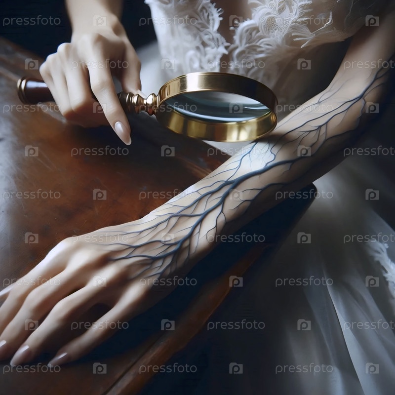 Невеста изучает свои собственные цветущие вены как ботанический образец под лупой, Ai generated image