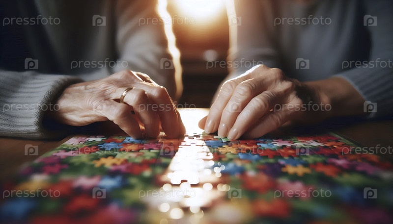 Клубовый снимок старых и молодых людей, работающих вместе над созданием головоломки на кухонном столе