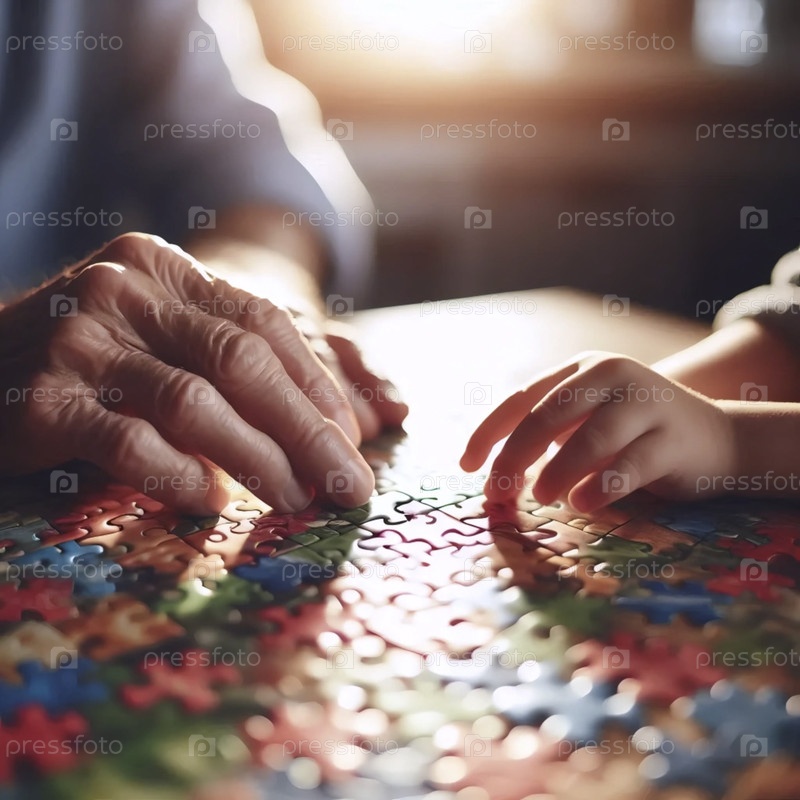 Клубовый снимок старых и молодых людей, работающих вместе над созданием головоломки на кухонном столе