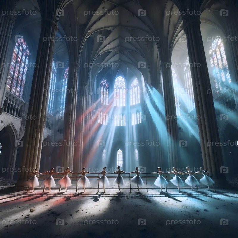 Репетиция балетного бара в заброшенном соборе, стеклянный свет рисует танцоров, Ai generated image
