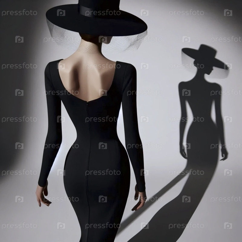 Женщина сзади, одетая в драматическую черную шляпу-пиллебокс со зонтиком на лице, уходит, Ai generated image