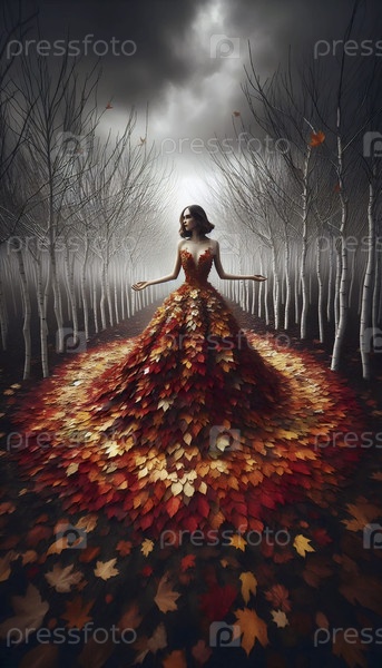 Невеста в одежде из осенних листьев стоит вокруг мертвых деревьев, Ai generated image