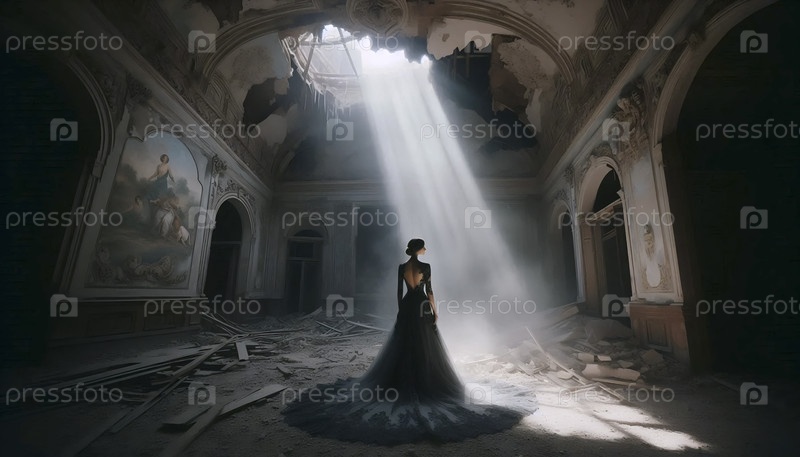 Невеста в разлагающемся кольцевом платье стоит на луче света внутри заброшенного бального зала, Ai generated image