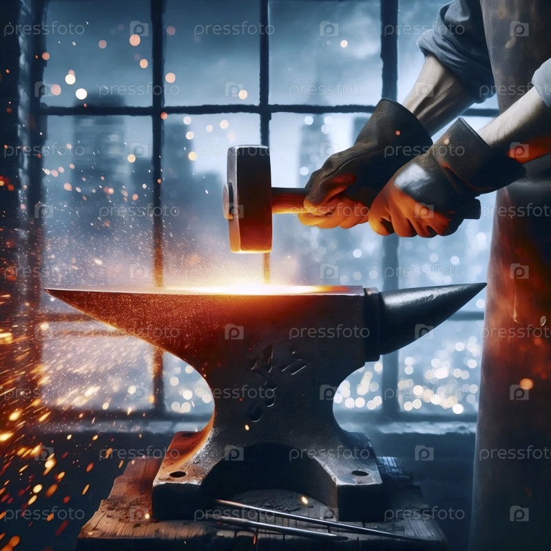 Руки кузнеца ковают лезвие, искры летают против темного окна с видом на город, Ai generated image