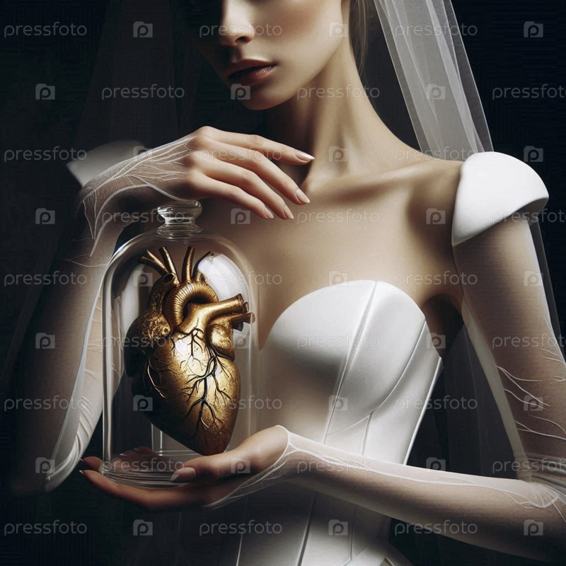 Невеста держит человеческое сердце в стеклянной колокольни как редкий образец, Ai generated image