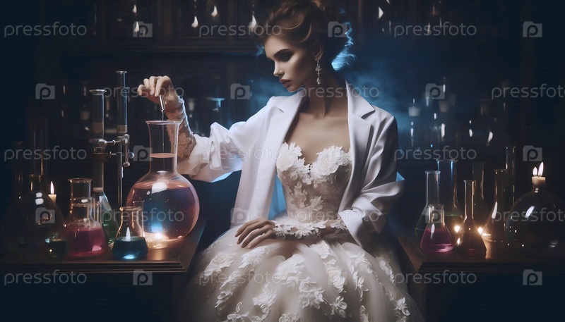 Невеста в стерильном лабораторном пальто над ожерелье платье, создавая светящийся зелье в стакане, Ai generated image