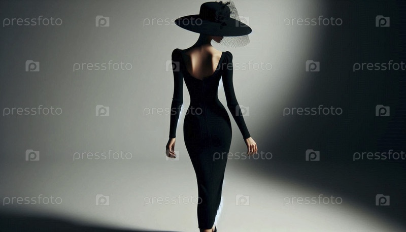 Женщина сзади, одетая в драматическую черную шляпу-пиллебокс со зонтиком на лице, уходит, Ai generated image