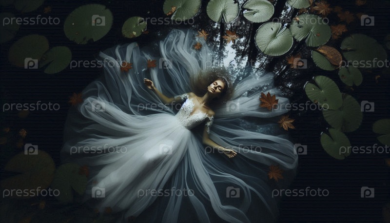 Невеста лежит погружена в лесной пруд, ее белое платье цветет вокруг нее как водный лилия, Ai generated image
