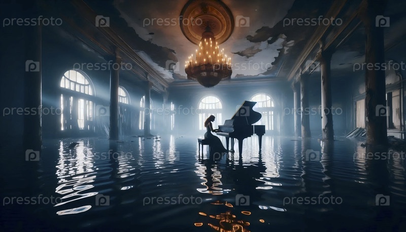 Музыкант, играющий на пианино, который наполовину погружен в затопленный бал-зал с украшениями, Ai generated image
