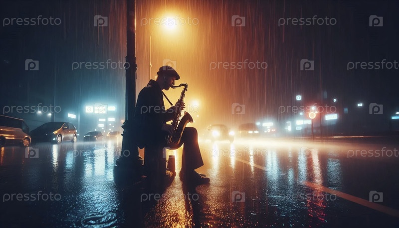 Саксофонист играет под уличным фонарем в проливный неоновый дождь, Ai generated image