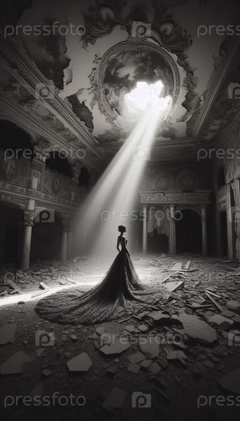 Невеста в разлагающемся кольцевом платье стоит на луче света внутри заброшенного бального зала, Ai generated image