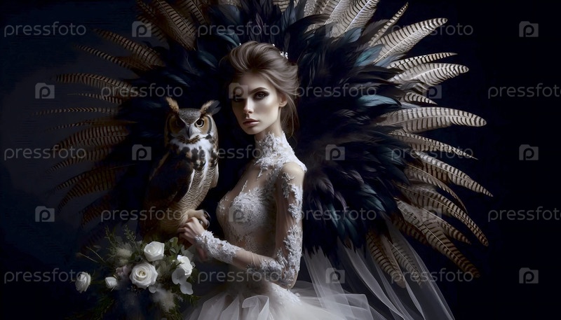 Невеста в пернатом плаще с большой рогатой совой, сидящей на ее плече, Ай создала изображение