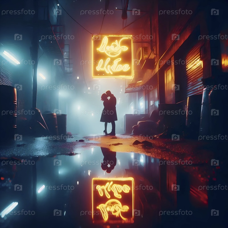 Поцелуй в дождь под сломанным неоновым знаком, отражающимся на миллионе городских лужек, Ай создал изображение