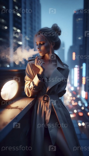 Балерина в плаще курит сигарету на неоновой крыше, Ai generated image