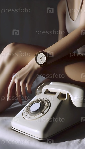 Женское запястье, носящее тонкие золотые часы, ее рука опирается на телефонный циферблат старинного ротационного телефона