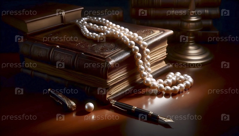 Шнурок жемчуга, застрявший на страницах кожаной книги на столе, Ай создал изображение