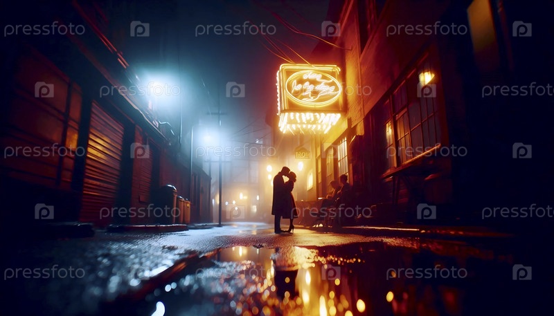 Поцелуй в дождь под сломанным неоновым знаком, отражающимся на миллионе городских лужек, Ай создал изображение