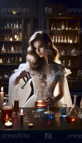 Невеста в стерильном лабораторном пальто над ожерелье платье, создавая светящийся зелье в стакане, Ai generated image