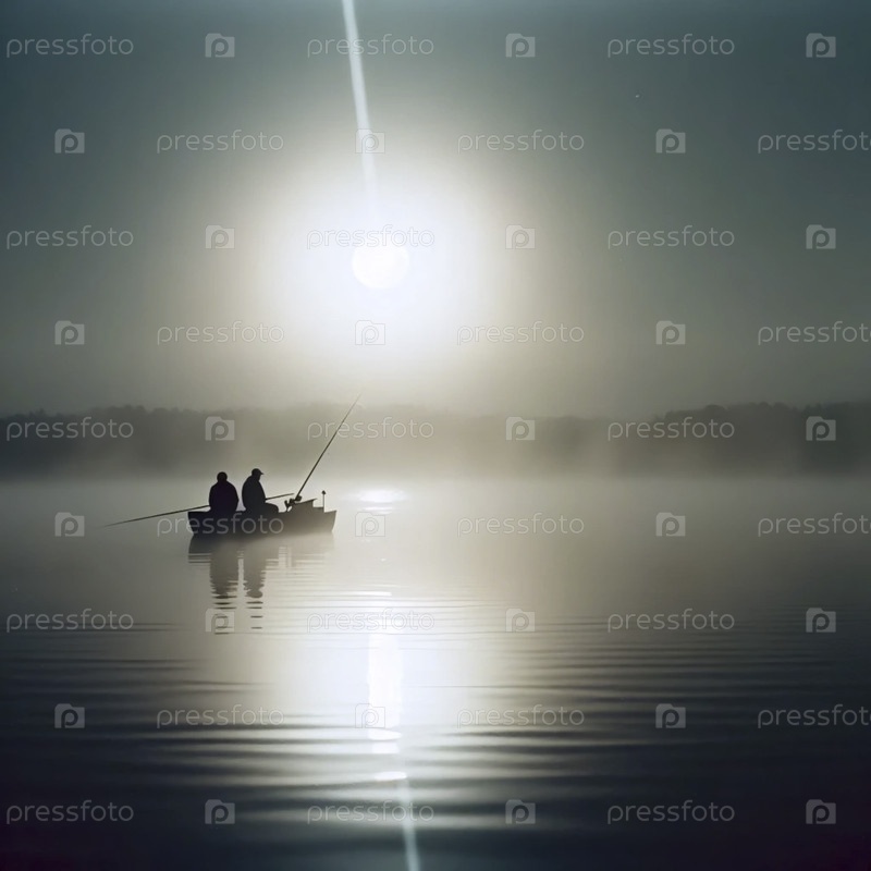 Спокойный момент, когда отец и маленький ребенок ловят рыбу у причала на тихом озере, ранний утренний туман поднимается, Ai создал изображение