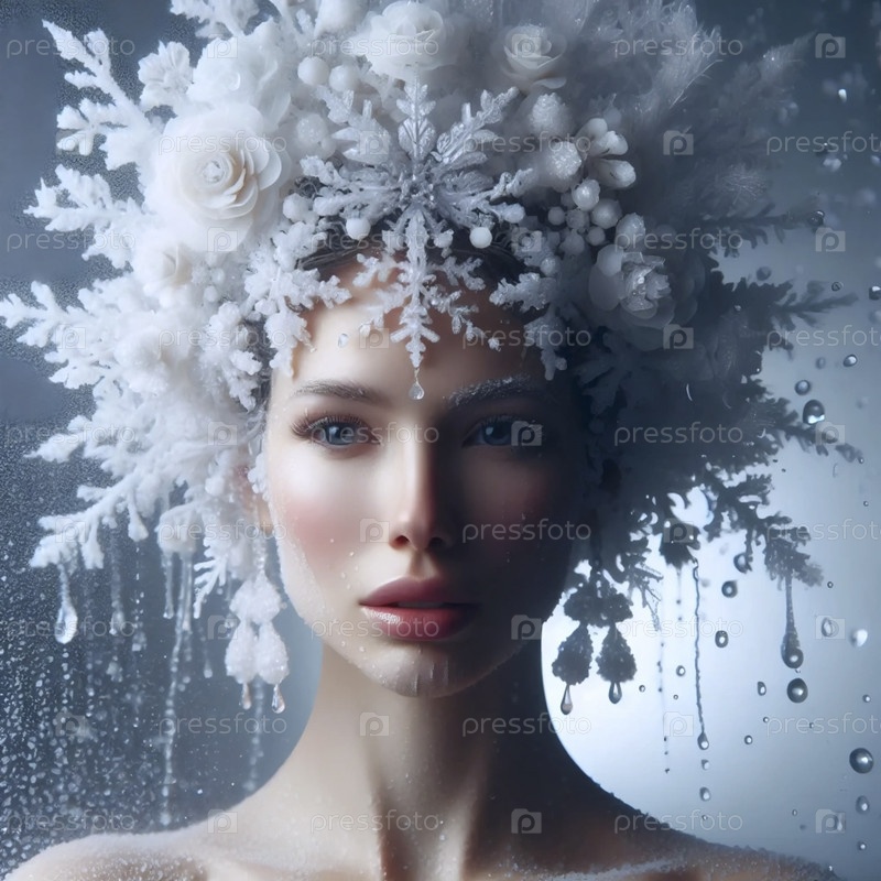 Невеста в головном уборе из сложных, замороженных кристаллов льда, которые медленно тают, Ai generated image