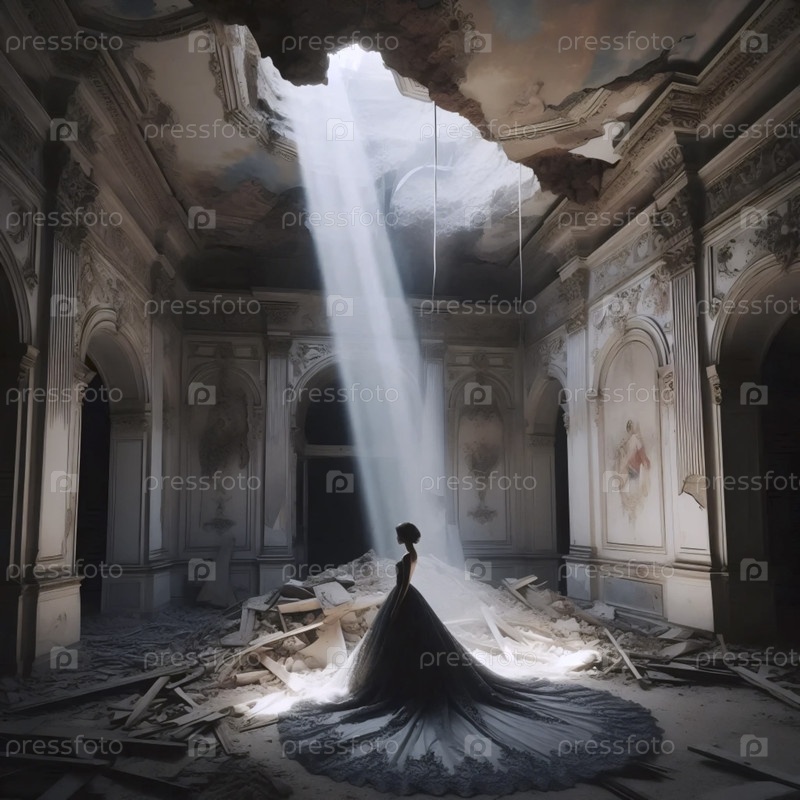 Невеста в разлагающемся кольцевом платье стоит на луче света внутри заброшенного бального зала, Ai generated image