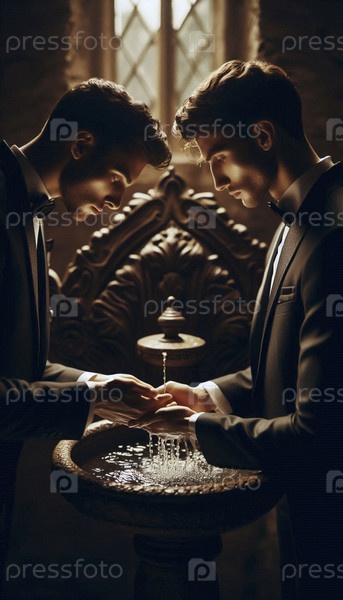 Два жениха в черном портюре тихо моют друг другу руки в каменном бассейне, Ai generated image
