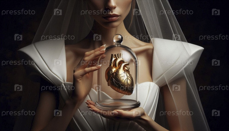 Невеста держит человеческое сердце в стеклянной колокольни как редкий образец, Ai generated image