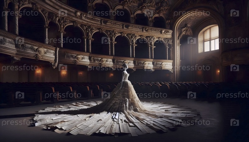 Невеста в платье из тканей черного музыкального манускрипта, стоящая в заброшенном оперном театре Ai generated image
