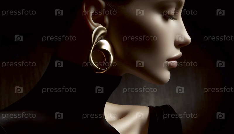 Профиль женского уха с большой, скульптурной золотой серёжкой на черном фоне Ai generated image