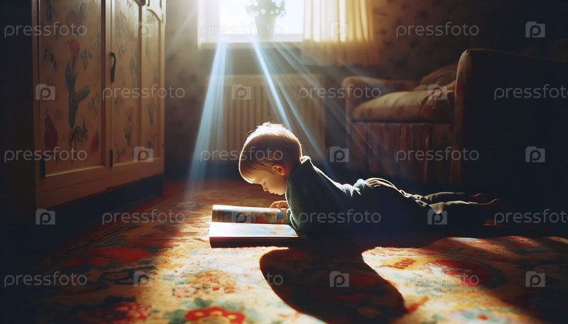 Ребенок, полностью погруженный в чтение комикса на полу гостиной с лучами солнца, освещающими его и страницы, создал изображение Ai