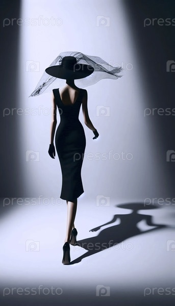 Женщина сзади, одетая в драматическую черную шляпу-пиллебокс со зонтиком на лице, уходит, Ai generated image