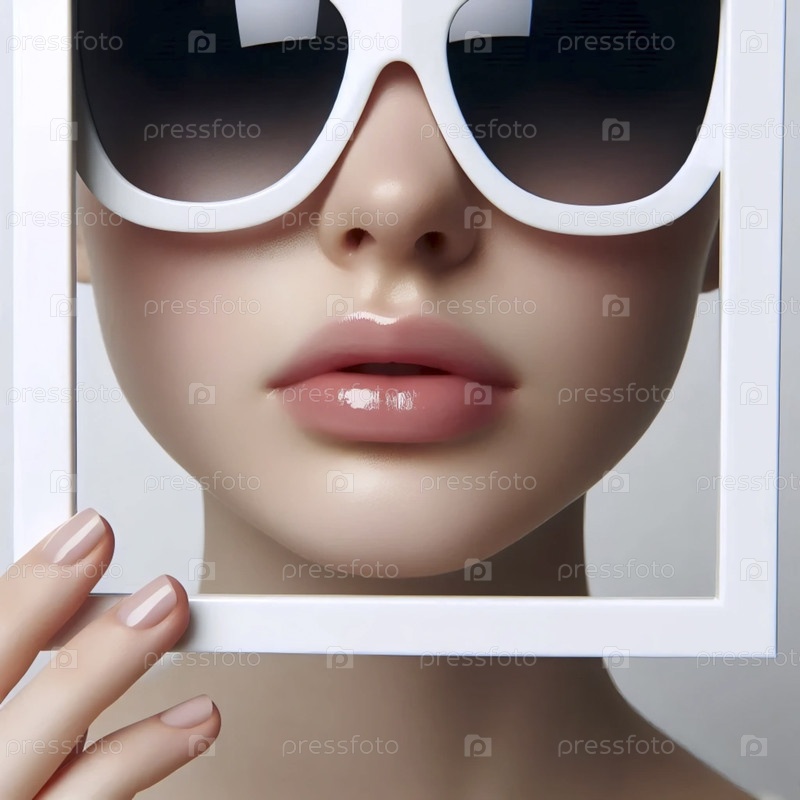 Лицо женщины, спрятанное за большими солнцезащитными очками с белой рамой, бледные губы разделились, Ai generated image