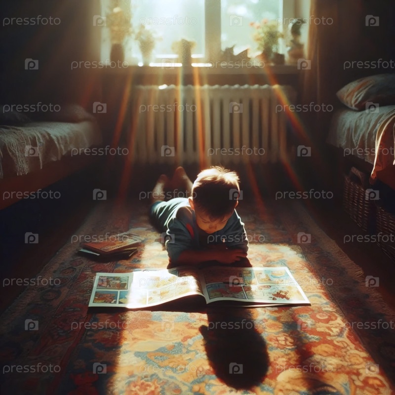 Ребенок, полностью погруженный в чтение комикса на полу гостиной с лучами солнца, освещающими его и страницы, создал изображение Ai
