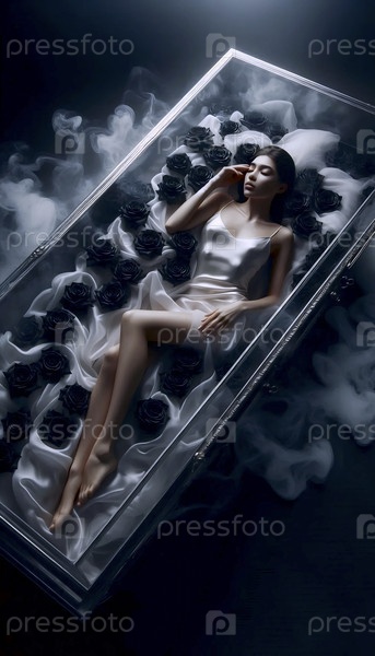 Невеста спит в стеклянном гробу, наполненном черными розами и дымом, Ai generated image