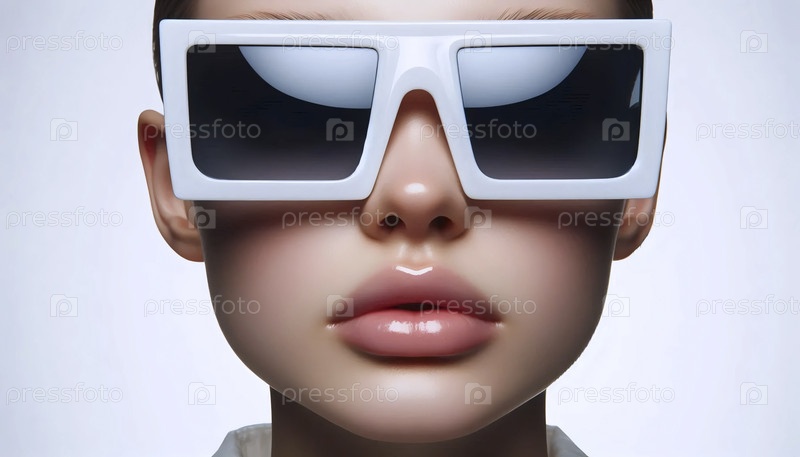 Лицо женщины, спрятанное за большими солнцезащитными очками с белой рамой, бледные губы разделились, Ai generated image