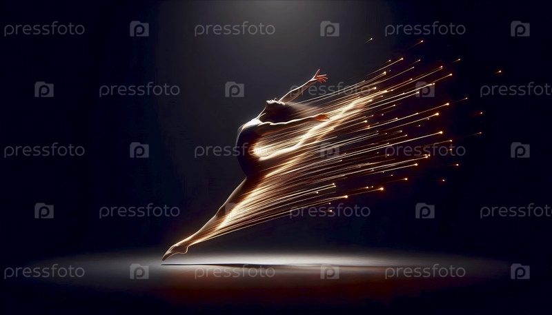 Танцовщица прыгает горизонтально через чистую черную пустоту, тело освещается как комета, Ai generated image