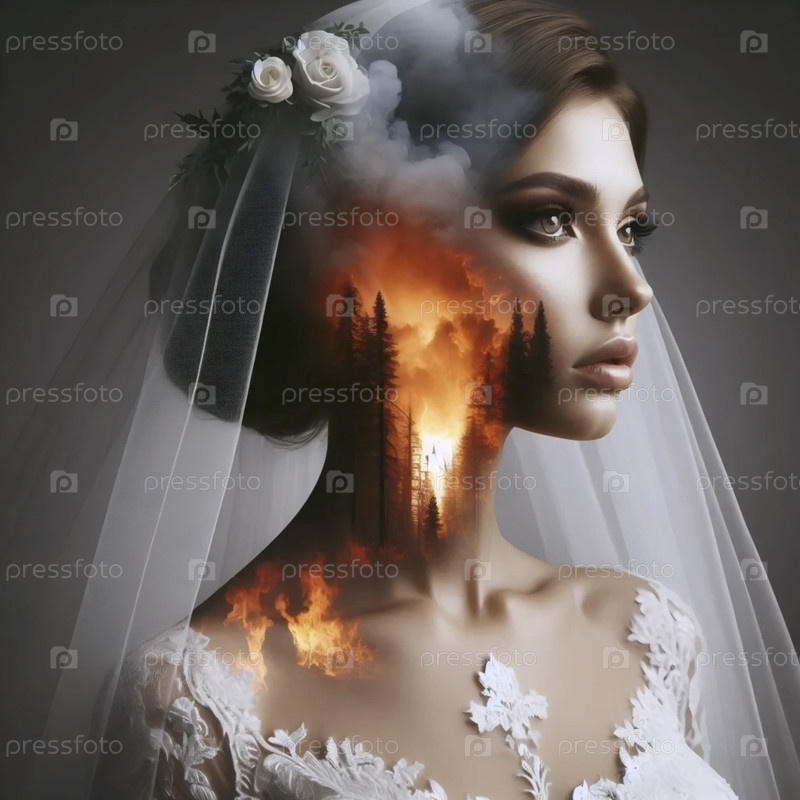 Портрет с двойной экспозицией: лицо невесты, перекрытое изображением рычащего лесного пожара, Ai generated image