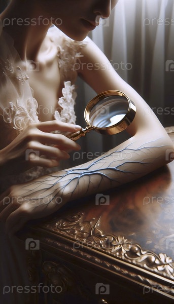 Невеста изучает свои собственные цветущие вены как ботанический образец под лупой, Ai generated image