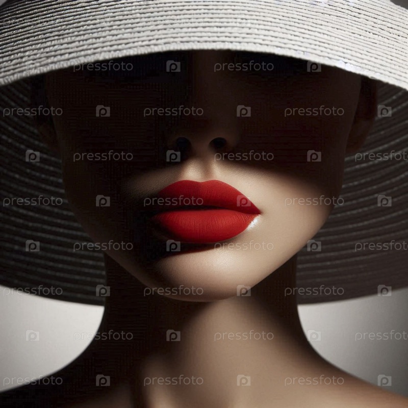 Широкошерстная шляпа, бросающая глубокую тень на лицо модели, видны только ее красные губы, Ai generated image